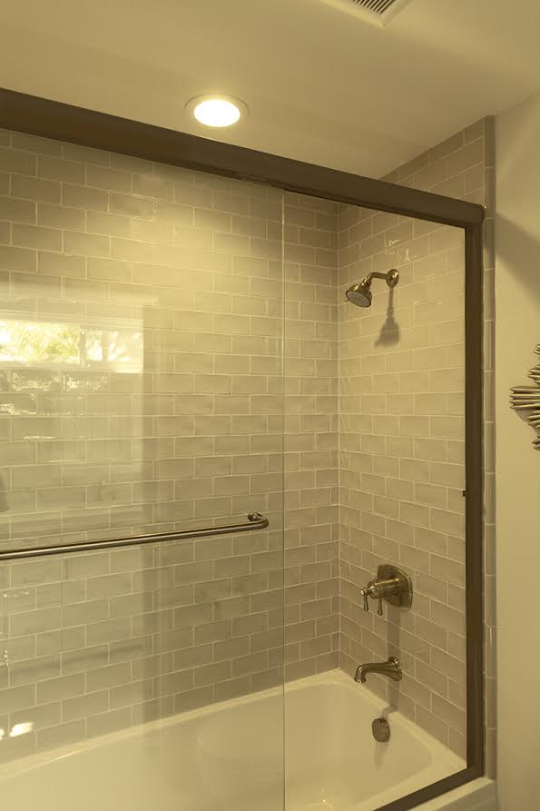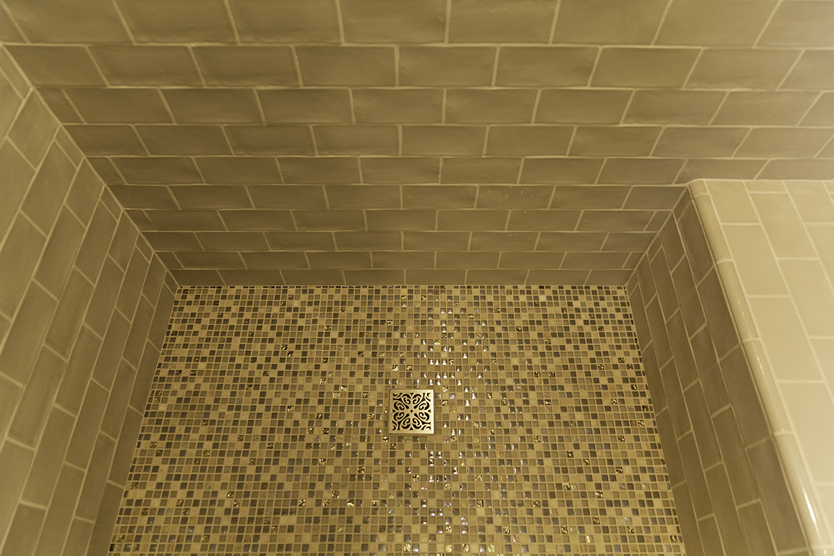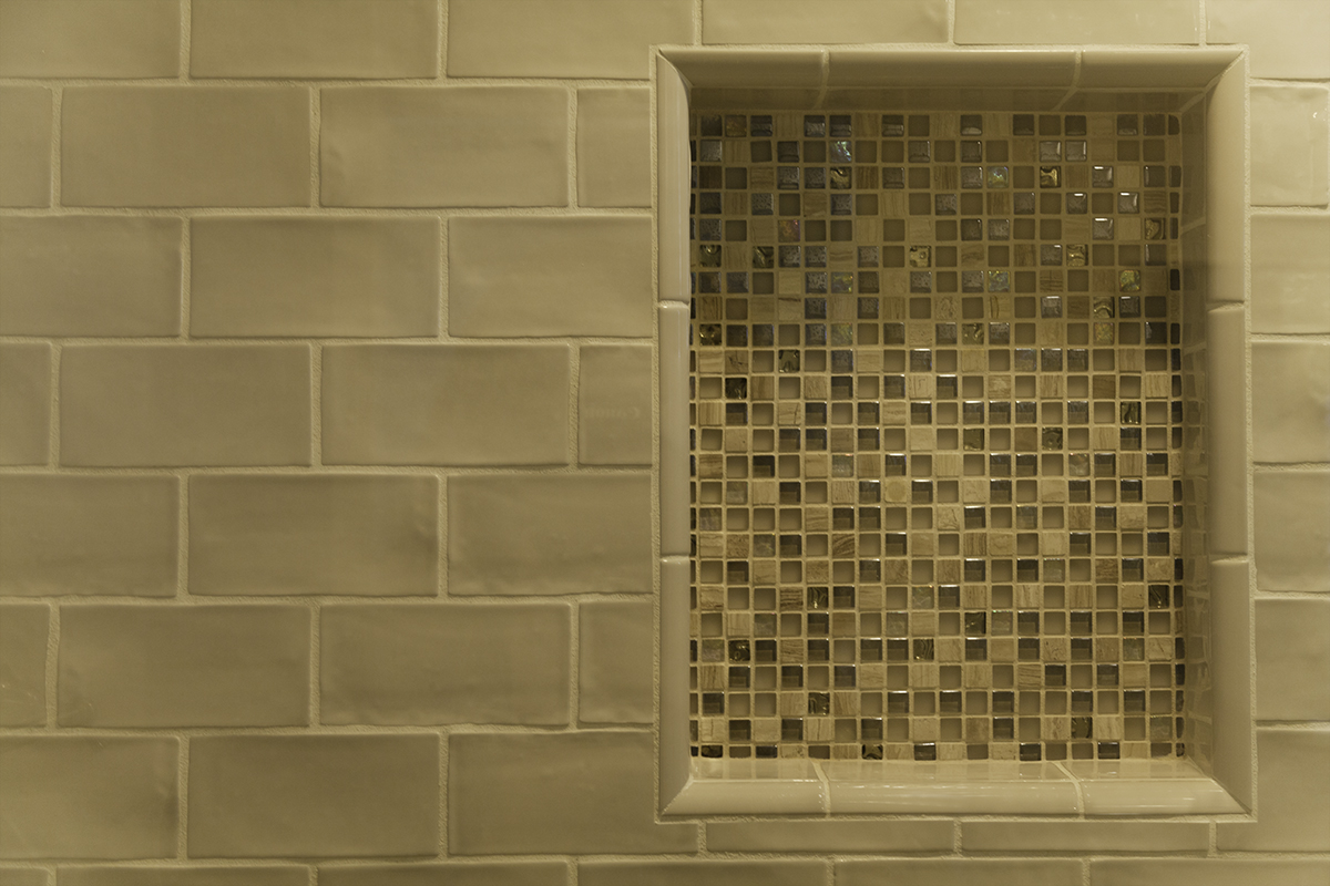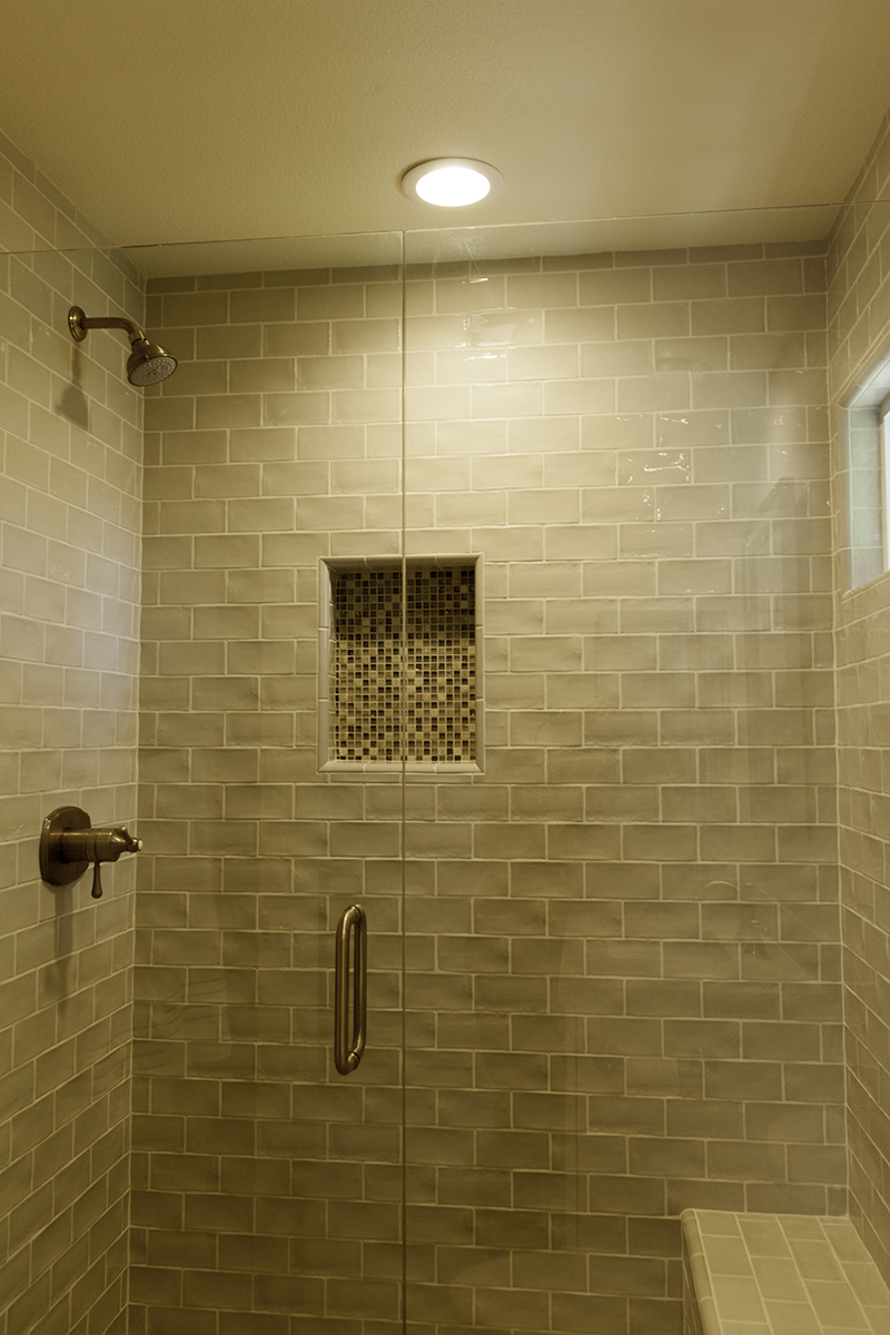Brushed Nickel Fixtures and White Subway Tiles in Both ShowersIn the guest bathroom, we added a window in the shower at the homeowners’ request. To add some color and style, glass mosaic tile brightens up the shower flooring and adds a touch of style on the recessed shower shelf. A decorative shower drain with a traditional look completes this shower space and links the traditional style of the rest of the bathroom with the shower.