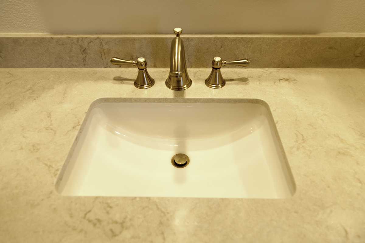 Undermount Sink Paired with Brushed Nickel Three-Piece FaucetBoth bathrooms have white subway tiles on the shower walls and clear glass doors to make the showers look more spacious and inviting. Traditional style brushed nickel plumbing fixtures enhance the showers and sinks in both rooms. The homeowners wanted a consistent neutral color scheme in both spaces, with white walls, white cabinetry, and beige tile for the flooring.